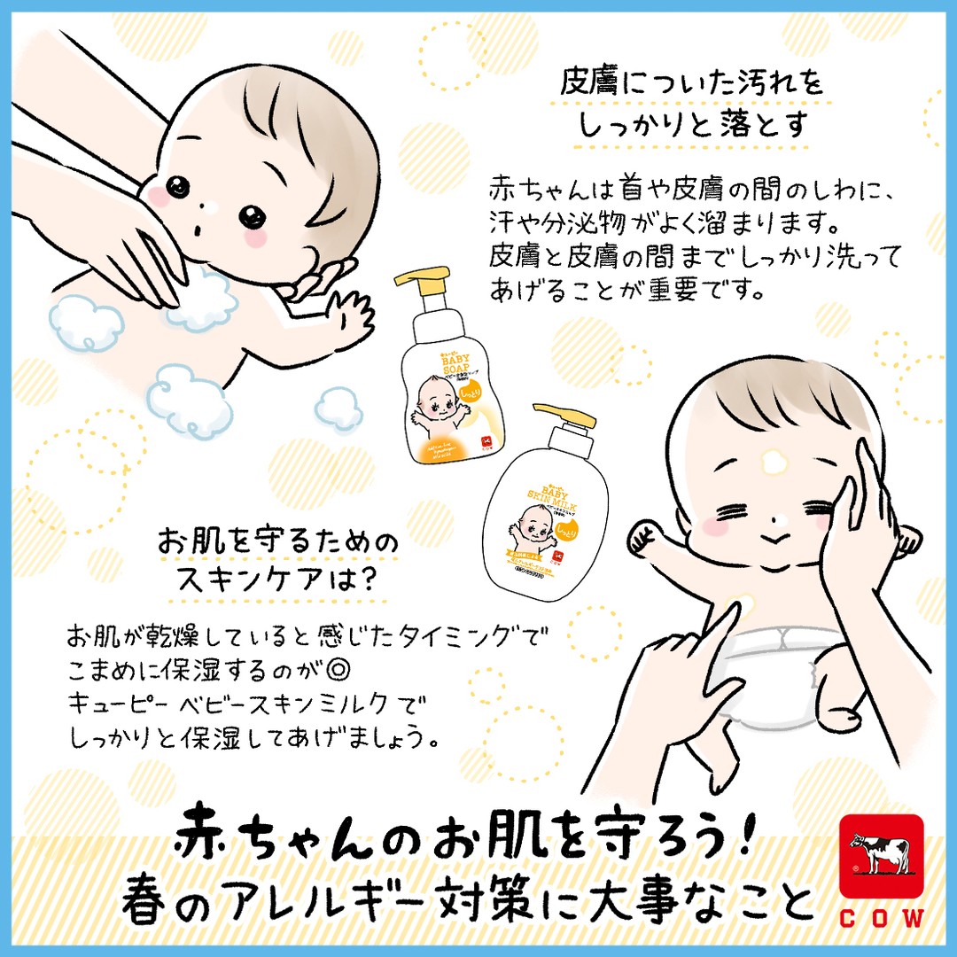 牛乳石鹸のキューピーベビーシリーズ公式アカウント 皮膚についた汚れをしっかりと落とす 赤ちゃんはとても汗っかき 首や皮膚の間のしわに 汗や分泌物がよく溜まります これらが肌荒れ アレルギー物質の要因に お風呂で 皮膚と皮膚の間まで